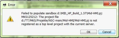 3. I get an error window like : Failed to populate sandbox d:/sandbox/sandbox.pj MKS125212: The project file d:/project/project.pj is not registered as top level project with current server.