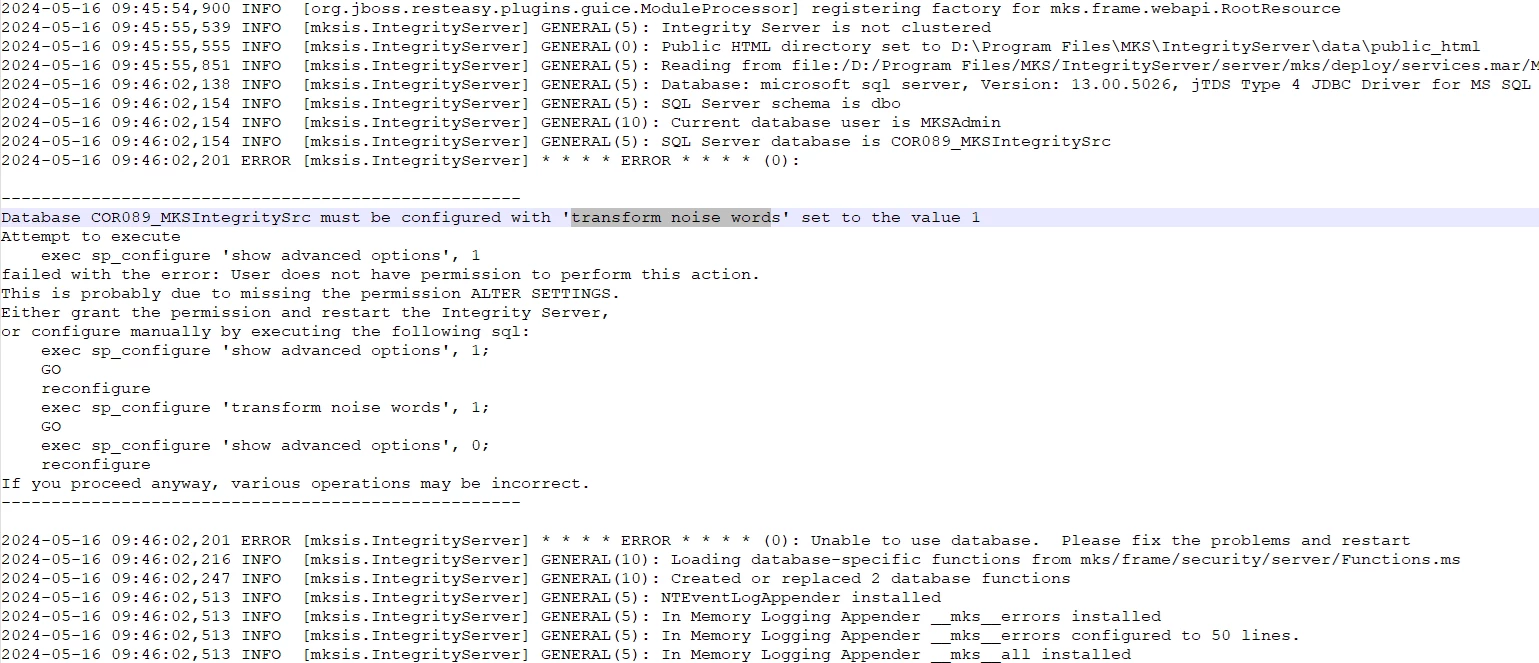 2024-05-17 14:42:35,649 ERROR [mksis.IntegrityServer] * * * * ERROR * * * * (0): Unable to use database. Please fix the problems and restart