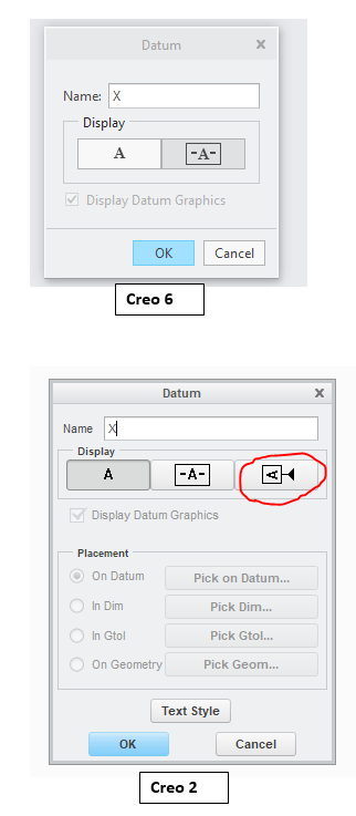 Thanks for your comments. For datum created in the drawing file, the display option could be used to add a plunger, but when the datum comes from the model, I don't know how to change it. It seems that in new versions the datum should be created in the drawing mode to manage it easier. To make it clear what I mean, the following figure added to show the datum properties in Creo 2 and Creo 6. As it showin there is no direct adjustment for the display of datum in Creo 6 parametric.