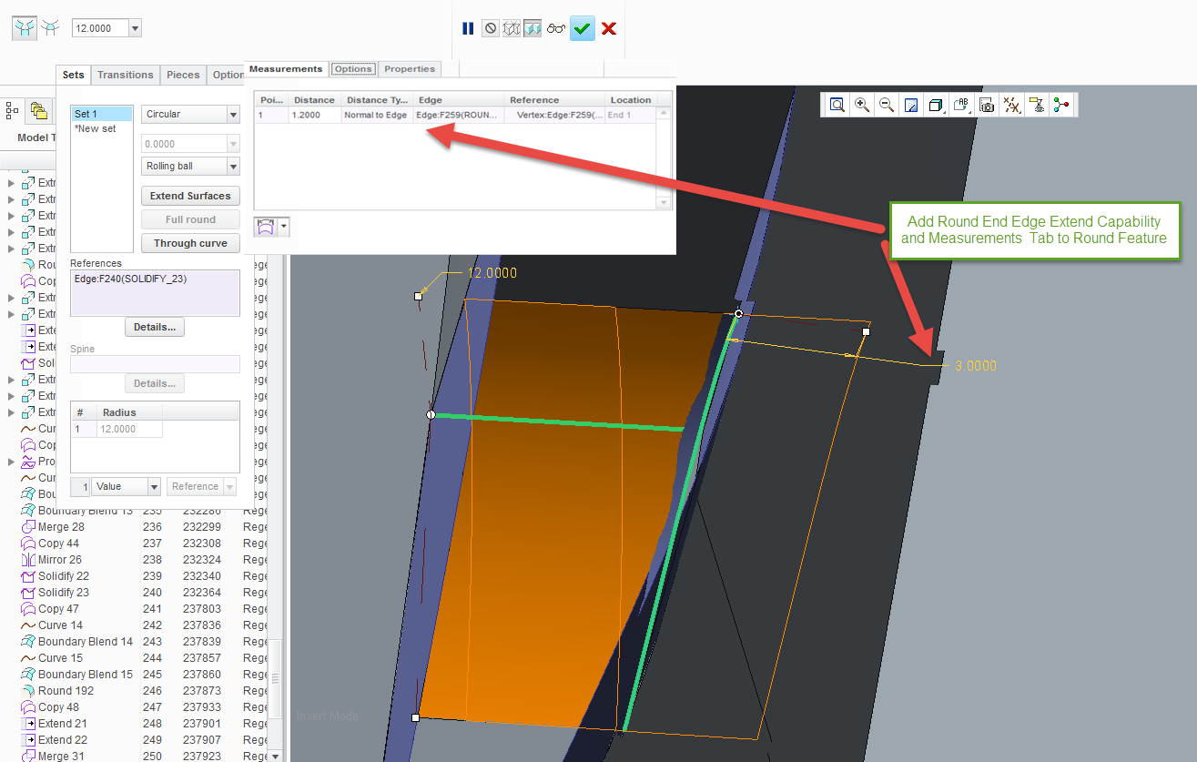 This would eliminate the need for 2 extend features in the model tree and reduce time to round corners where pro/e not able to produce round transitions.