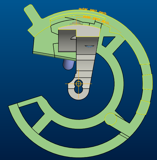 Hi I have a rotating mechanism that travels a total of 60degrees. An inner part rotates with an outer part for the first 40 degrees, and then stops rotation and moves in a linear vertical direction for the last 20 degrees. The vertical motion is driven by a ramp on the inside surface of the outer part. See screenshots.