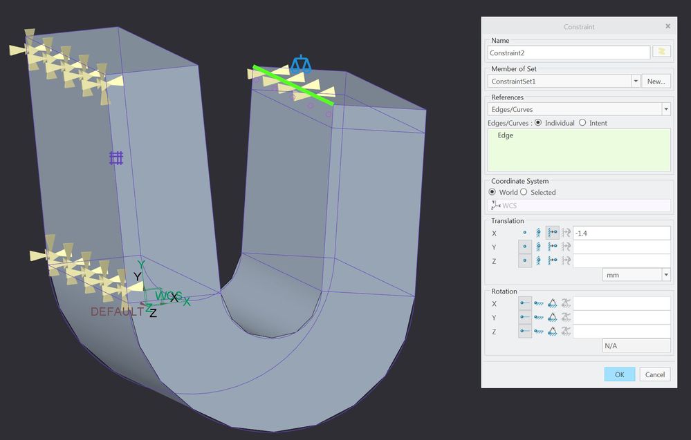 Confirmation? Run this model with found force (48N in this case) in X direction as a load in place of the enforced displacement. Confirm max displacement about 1.4mm in X direction.