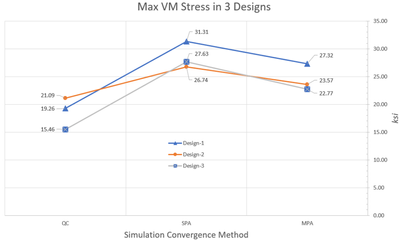 Good morning, I ran stress analysis on 3 design options with 3 different convergence methods. The maximum stress results are shown in the diagram above. How to interpret it?
