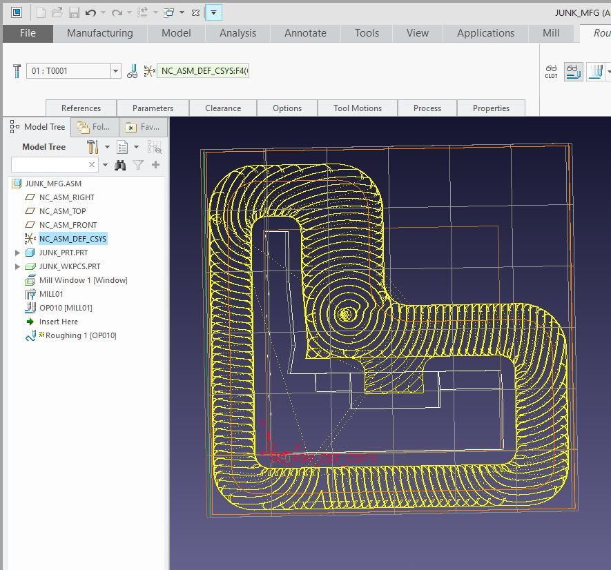 Running Creo 4.0, M030, NC Complete (not expert machinist like the label says - why doesn't the cnc, creo nc, manufacturing labels work?). Trying to use Roughing sequence then Re-roughing and sketched mill window while staying inside the sketched window outline.