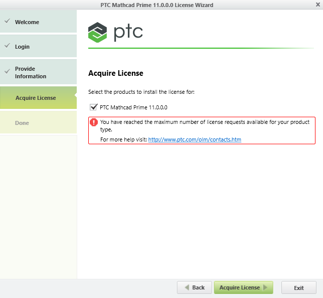 I'm having trouble activating my newly bought license for Mathcad prime 11.0. I had a license for Mathcad 10 on a different pc which worked without any trouble. Now when trying to acquire the new license for this version on a new system, it just gives me the error: "You have reached the maximum number of license requests available for your product type"