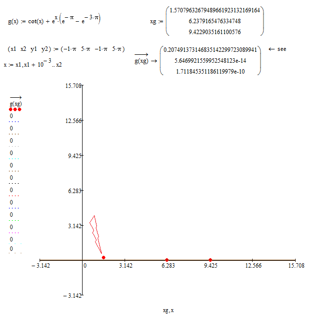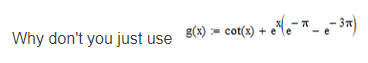 And again and again, so far the MATHCAD is the best one to me to use. And I have only a bit of knowledge and only about the MATHCAD. And I have not had any other Math software, but MATHCAD. And to me, the MATHCAD make MATH very simplest. As my demostration, The g(x) = cot(x) + e^(x)*{ e^-pi - e^(-3*pi) } and my function is NOT equivalent.