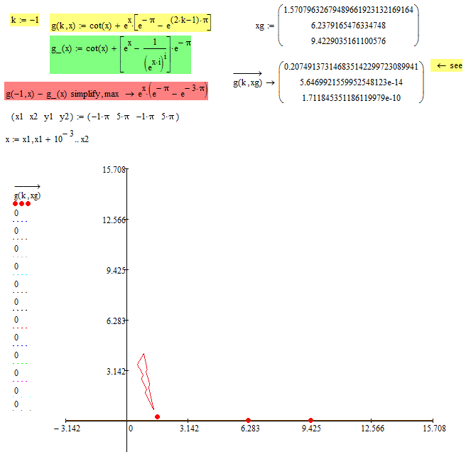 And : The g(k,x) = cot(x) + e^x*{ e^-pi - e^(2k-1)*pi } and g_(,x) = cot(x) + { {e^x - 1/{ [e^(x*1i)]^1i} }*e^-pi is NOT equivalent , EITHER :