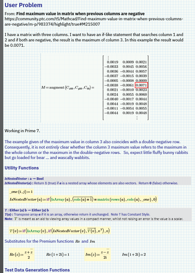 I was going to post a solution to this problem that I developed in Mathcad Prime 10 that I thought should have worked in Mathcad Prime 7. Only Tetsuro had posted a solution at that time. Then I remembered that I have Mathcad Express 7 on another laptop. By the time I'd copied out the solution, Werner had posted his first solution ... which was all but identical to mine. "Hmm", I thought, "If everybody's thinking the same, somebody's not thinking". But it was late, so I slept on it.