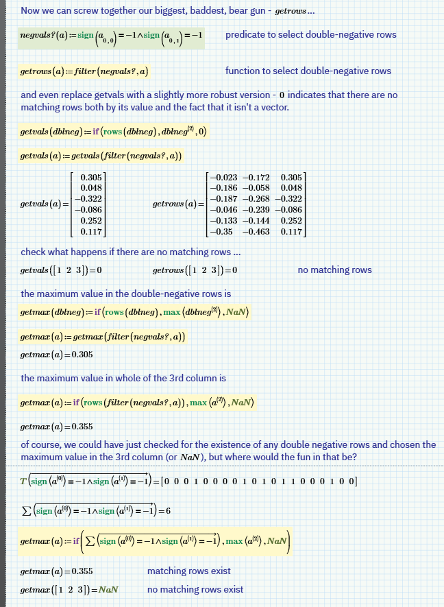 As is often the case with Mathcad Express solutions to a problem, it involves a dependency chain of functions that perform tasks that would normally be the provenance of a local variable. Nevertheless the desired functionality can usually be wrapped up into a single function that presents the user with a white box (as any good function should).