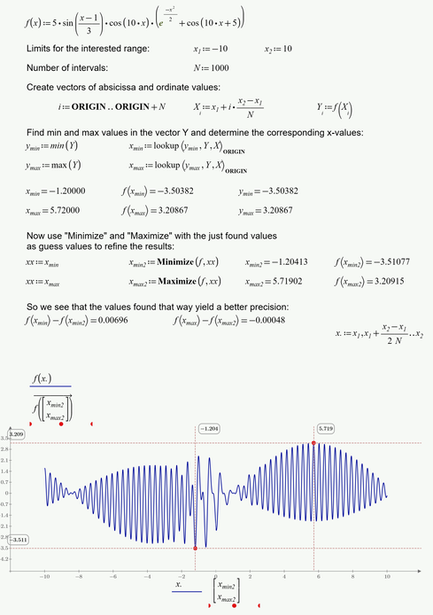 Using the derivative might seem like the most accurate way to solve the task but you may run in multiple problems. With simpler function you may be able to use the symbolics to find all extremas in a given range and then chose the absolute ones. But with just slightly more complex functions the symbolics might be overwhelmed. And when you switch to numeric evaluation via "root" or a solve block, you get only one solution (depending on a guess) which is not much helpful.