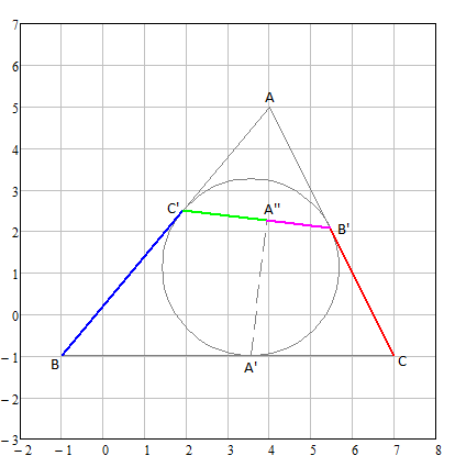 inscribed circle of triangle ABC touches its 3 sides at A', B', C'. (see Figure)