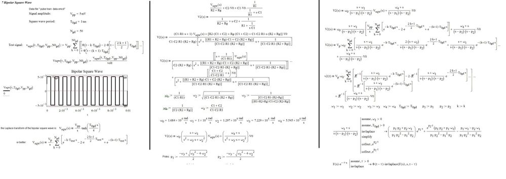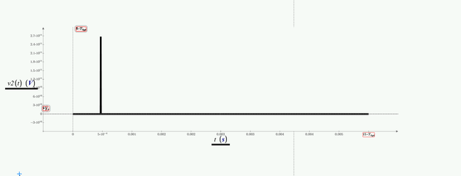 My results change the C to 2*10^-2, therefore, transient change in output signal is visible. However, Prime 5 of my devise only solve one or two input series of inverse Laplace transformation. It can also solve numerically three input pulse series. Therefore, I made the 3rd response as a series of rest 7 pulse responses.