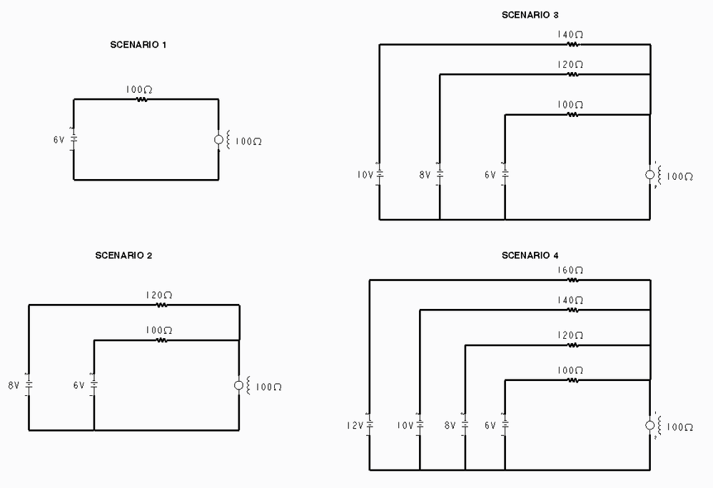 Scenario 1. We have a circuit with a motor (modeled as a 100 Ohm resistor), a 6V voltage source, and a 100 Ohm resistor. Calculate the current in the motor and the resistor.