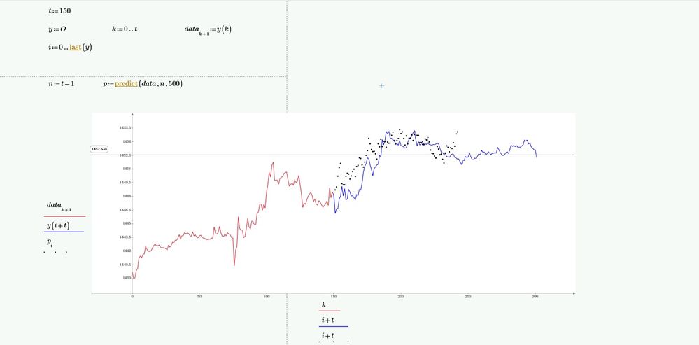 I have a very similar curve from a stock market. I am using this function and it seems that sometimes works, sometimes not. I am guessing that is because the quantity of the sample used to predict. In your posts, you use like a half of the range (k=0..99 so n=50), and yu have very good results. I am trying.