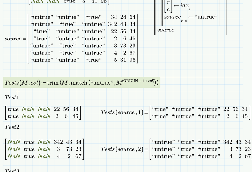 If you replace the NaN's with zero's (0) and the True's with negative one's (-1), you can use the csort() function and select column 0, 1 or 2, then use match() to find the last -1 in that column, which gives you the row index of where it's 'true'. With the total number of rows and columns in the matrix, AND that row index you can call the submatrix() function to get the exact part of the matrix that you need.