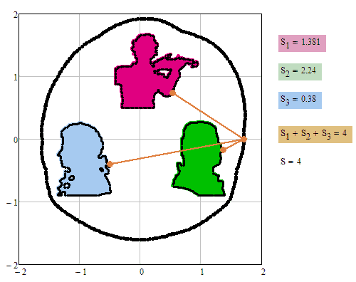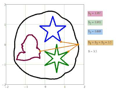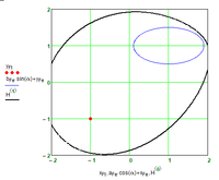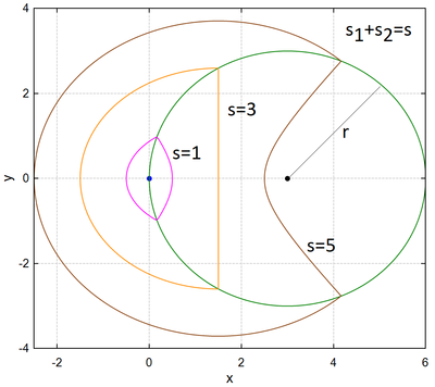 Figure shows a family of closed curves, which can be called these same ellipsohyperbolas. These are ellipses, in which the first focus is a traditional point, and the second focus is a circle. Outside the circle we have ordinary ellipses, and inside the circle we have branches of a hyperbola. This can be verified not only visually, but also mathematically - inside the circle, addition (ellipse) turns into subtraction (hyperbola). The ellipse (oval) on the border of the circle turns into a hyperbole at an angle and can finally bring harmony into the soul of the poet - see the divertissement epigraph. If you smoothly change the S parameter, you get an animation - a small green snake (a straight line segment between the left focus and the left edge of the circle) predatory (see the second name of the divertissement) swallows the circle in much the same way as a boa constrictor swallows a rabbit. At the end of this process, the ellipsohyperbola becomes a rather plump ellipse.