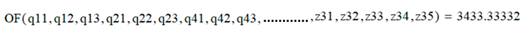 Next step is to determine what the dimensions of the vectors/matrices q (5x3), y (3x5) and z (5x5) would be and which elements of these vectors must be set to constant zero. E.g. q31, q32 and q33 must be constant zero because there is no connection from feed #3 to any of the three pools. Likewise only row #3 in z is non-zero because feed #3 is the only feed with direct connections to the five products.