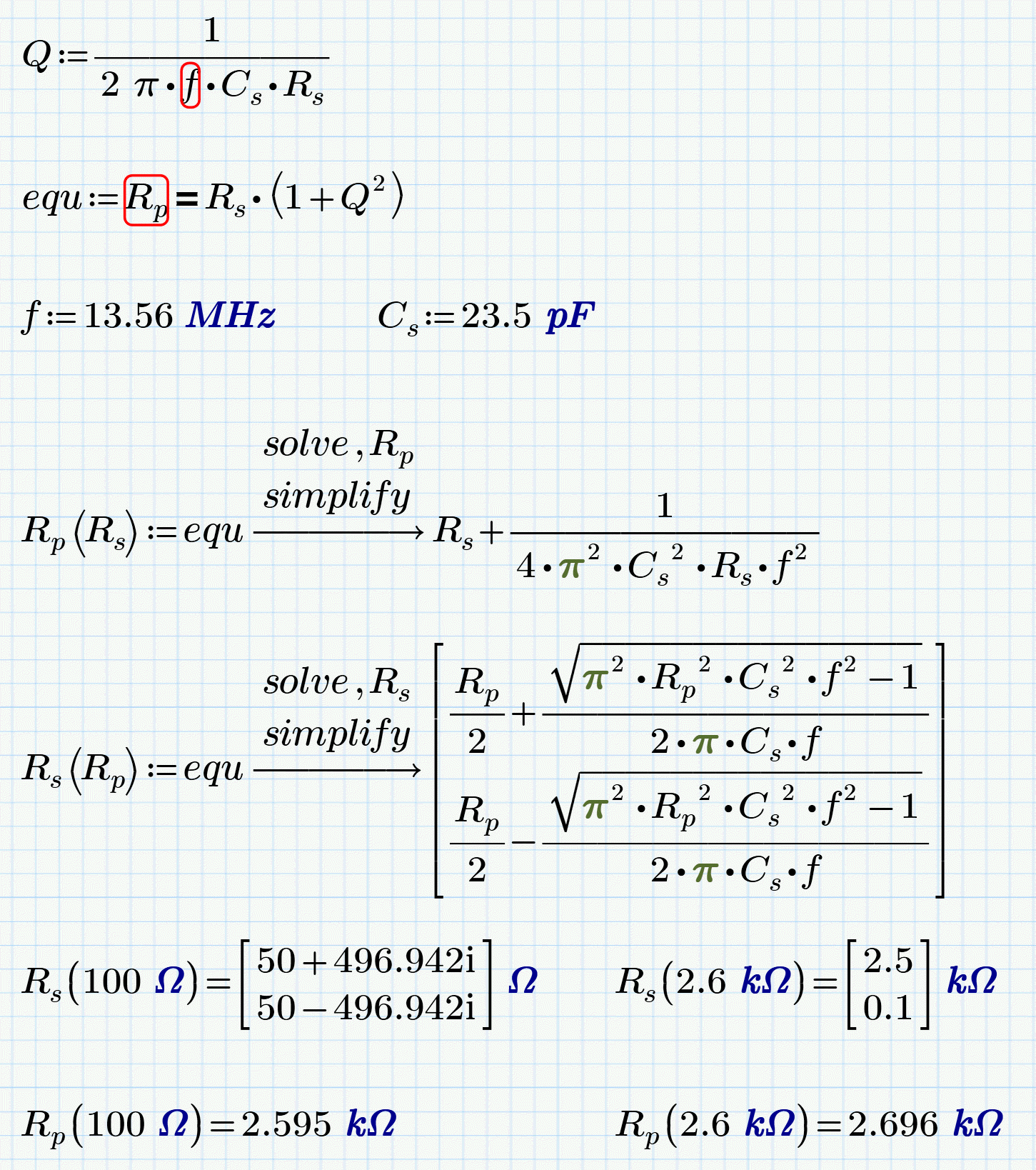 However, your (or should I say Mathcad) solution is wrong : if you compute Rp "normally" with Rs = 100ohm you'll get Rp=2.6kOhm, not 1.6kOhm