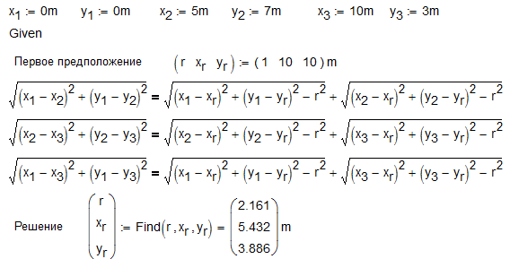 Рис. 13.2 Расчет в среде Mathcad радиуса окружности, вписанной в треугольник