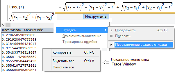 Рис. 13.4 Численное решение задачи об окружности, вписанной в треугольник