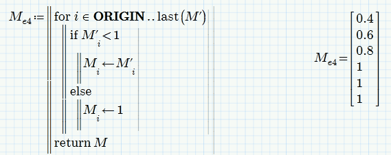 Problem: I have a vector called M' with 100 elements in it. I want to check the condition "If (M'<1)". If the condition is true it should assign a new vector Me with M' value in the corresponding position, If the condition is false it should assign 1 to the new vector Me for the corresponding position. I am getting an error stating that the value must be scalar.