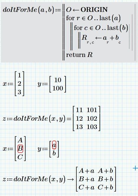 Hi, is it possible in Mathcad 15 or Prime to do a vector element by element addition that takes as input 2 vectors for example,vector x = [ A,B,C ] and y = [ a,b ] and has as output z = A+a, A+b, B+a, B+b,C+a & C+b ?