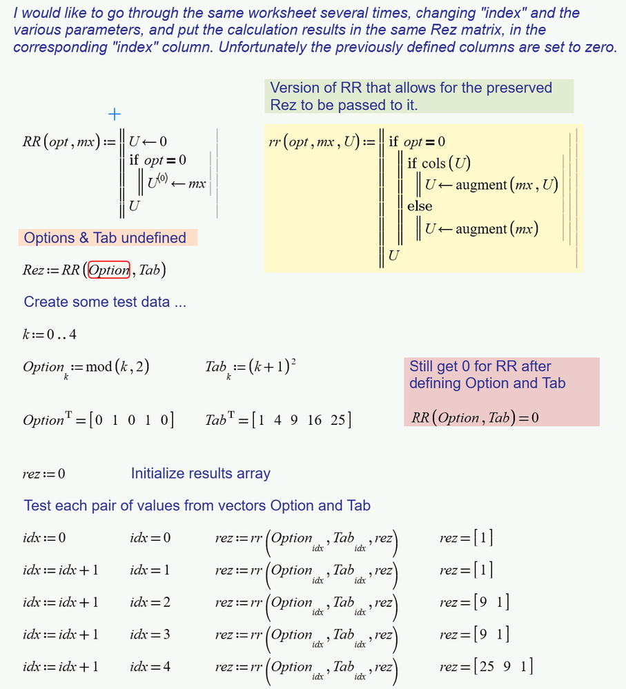 I would like to go through the same worksheet several times, changing "index" and the various parameters, and put the calculation results in the same Rez matrix, in the corresponding "index" column. Unfortunately the previously defined columns are set to zero.