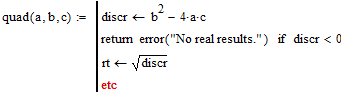 i want to write a program in MathCad 15, that can find a roots of the quadratic equation in subset of real numbers. Result will be a vector, or text: "this equation dont have result in real numbers"