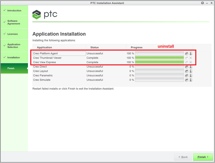 Im attempting to install creo, creo common files, and several others, installed fine, however it failled to install creo platform agent. In the installation manager it simply says "unsuccesful"