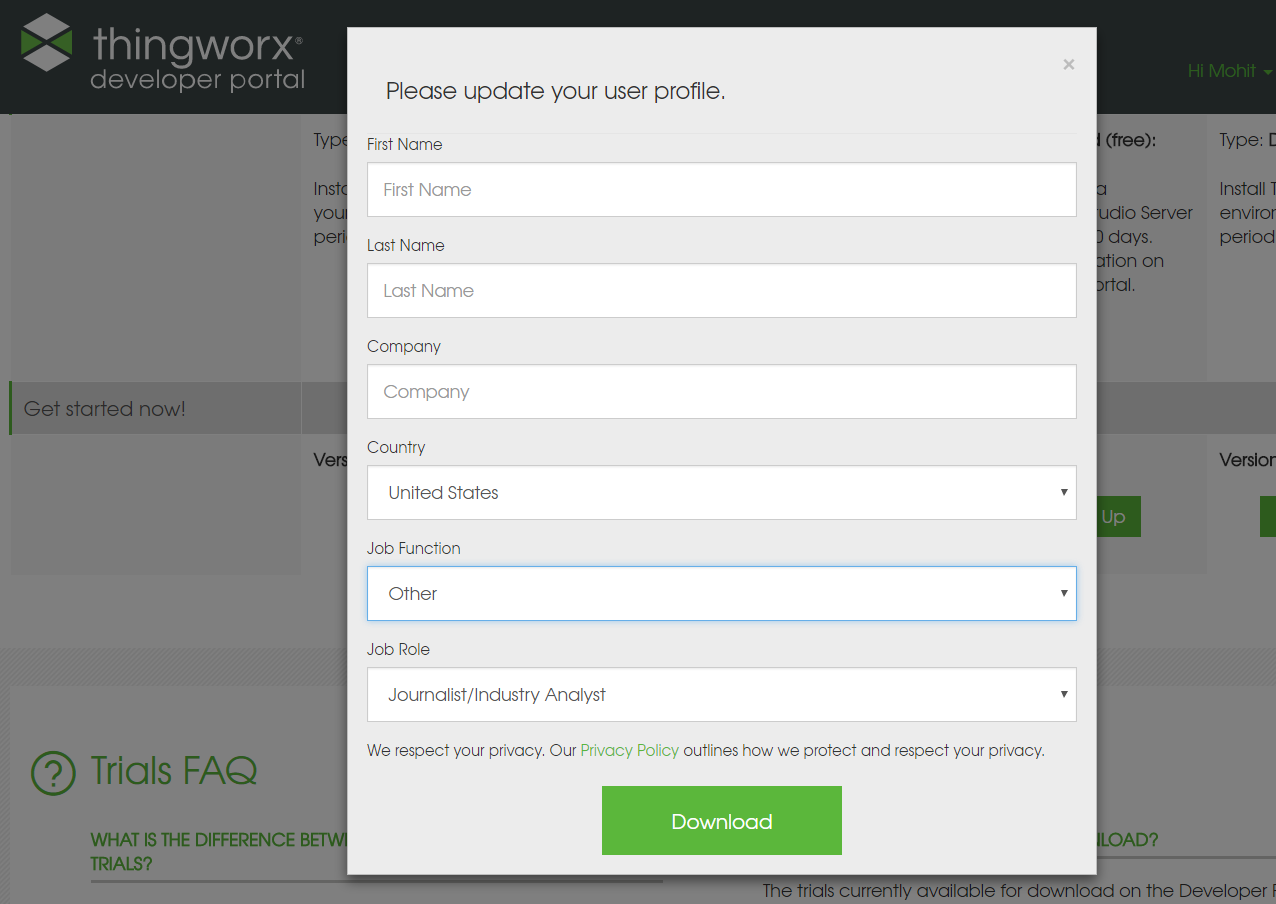 Please confirm are you getting the user profile window to fill information after clicking the download button.