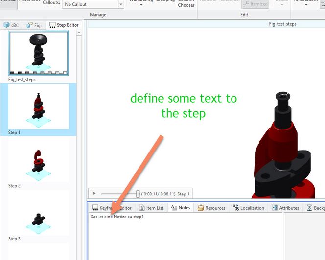 So In Creo Illustrate (e.g. 5.0) we can define a text note to a step.