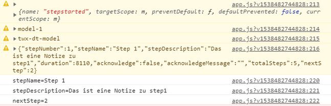 2018-10-02 05:22:05.532 -07:00 [Debug] event [stepstarted] broadcast on rootScope and dispatched against domID [model-1] with type [null], targetName [model-1] and data [{"stepNumber":1,"totalSteps":5,"stepName":"Step 1"}]
