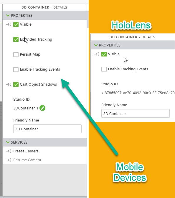 When we consider the 3d Conatiner widget property we can observe a difference between the HoloLens and mobile device: