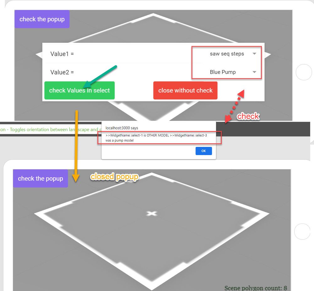 That is, first I call the pop-up window. In the pop-up window are also the drop down widgets. Here I can select different configurations. I then confirm this with a command button. A screenshot is attached.