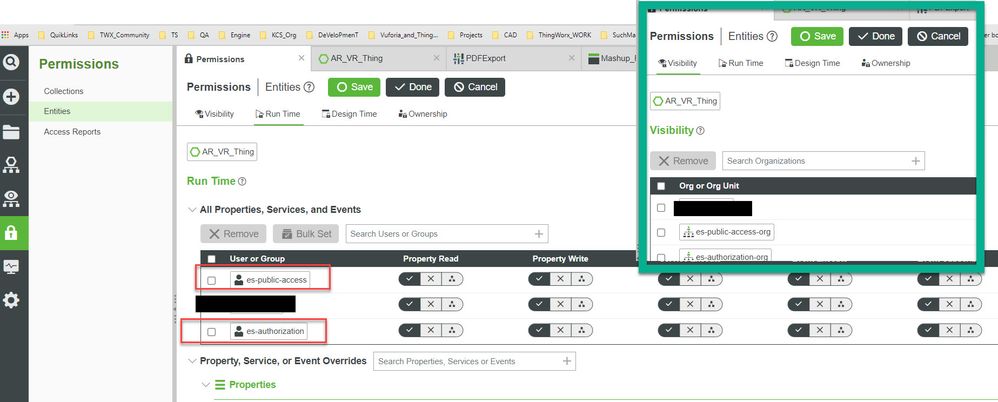 Furthermore you need also to check the permission of the TWX entity what is displayed via the External Data in your Vuforia Studio project. So, e.g. we need to set the thing permissions -here in the example the AR_VR_Thing to set the visibility and the Runtime permission – so that normally to be able to access them in public or authorized projects.
