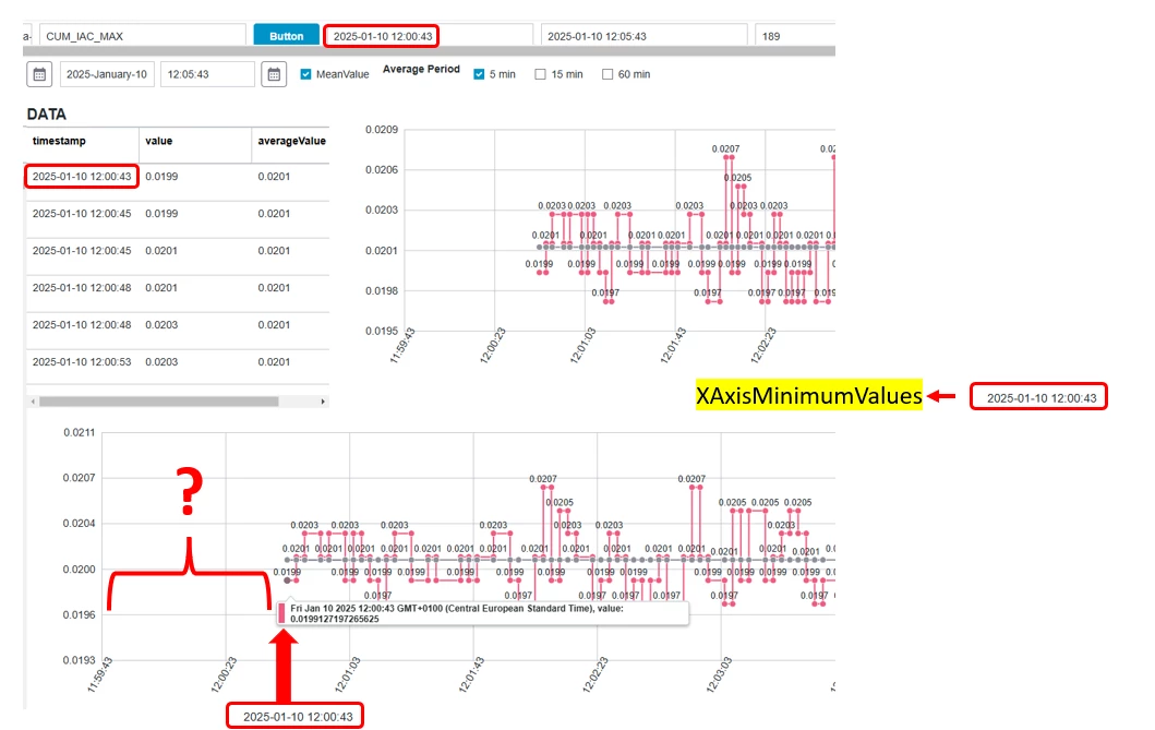 Thank you Tony, if I do not assign the values XAxisMinimumValues and XAxisMaximumValues, the widget presents empty areas on both the left and right of the graph as in the attached figure. I don't understand the problem (unless it is a bug), the strange thing is that on the right-hand side XAxisMaximumValues works correctly. Thank you Dimitri