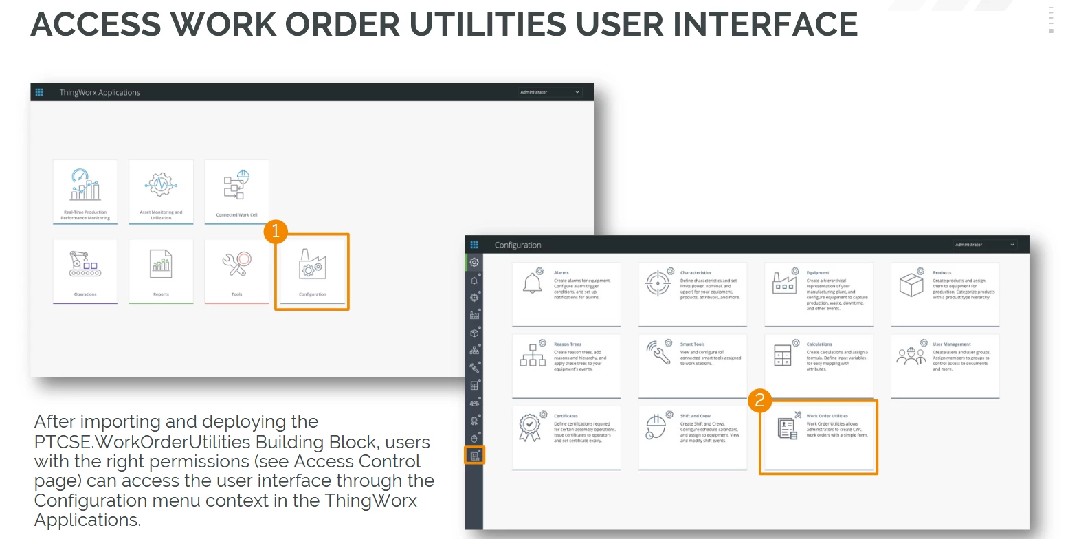 Quote: "After importing and deploying the PTCSE.WorkOrderUtilities Building Block, users with the right permissions (see Access Control page) can access the user interface through the Configuration menu context in the ThingWorx Applications".