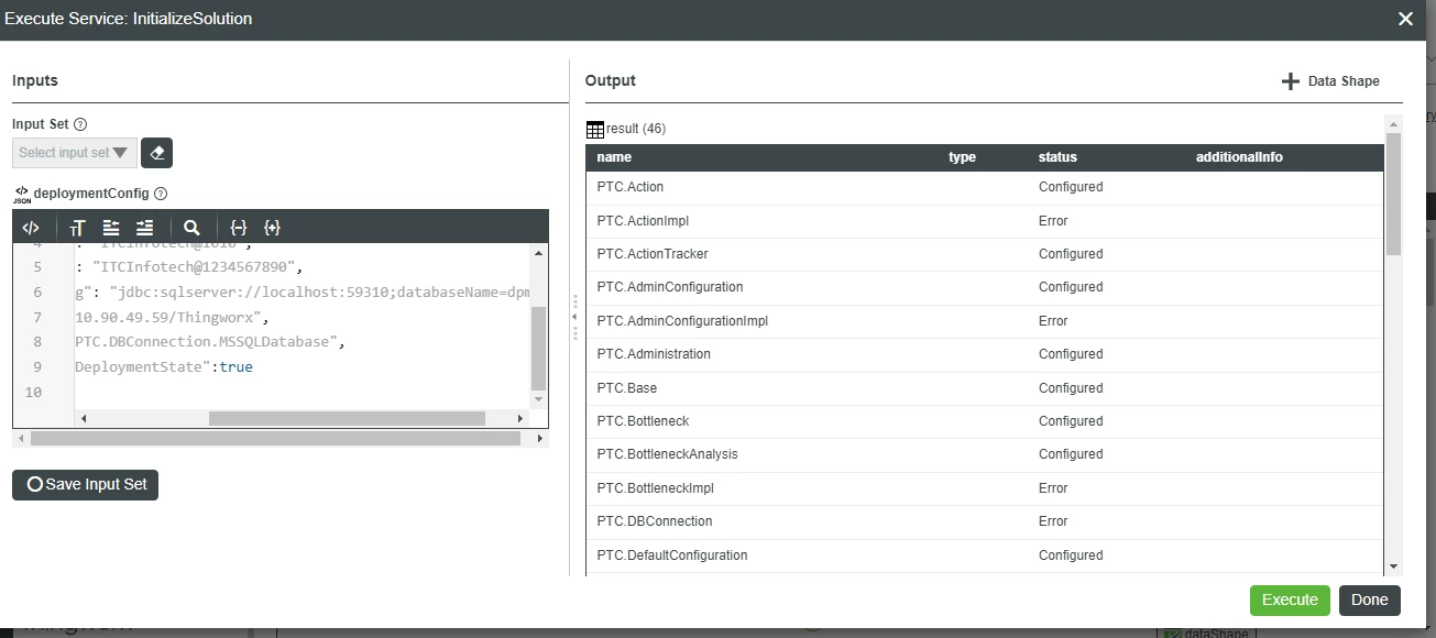 Were there any messages in the Script or Application Logs? Also what version of DPM are you trying to deploy? PTC.DBConnection.MSSQLDatabase was deprecated after 1.2.0. PTC.DBConnection.SQLThingDatabase is the new default.