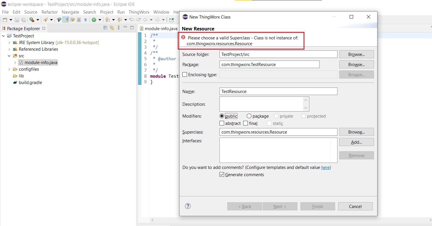 But I am getting an error as " Please choose a valid Superclass - Class is not instance of: com.thingworx.resources.Resource". Attached the screenshot with the post.