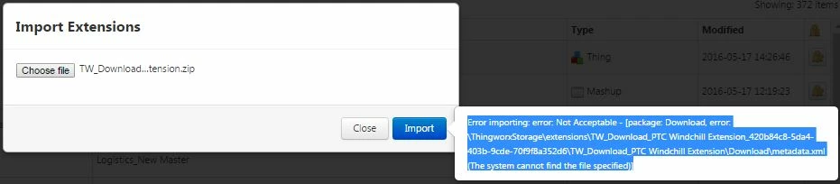 I am trying to import TW_Download_PTC Windchill Extension in Thingworx Composer version 6.0, but I am returning with error as "Error importing: error: Not Acceptable - [package: Download, error: \ThingworxStorage\extensions\TW_Download_PTC Windchill Extension_420b84c8-5da4-403b-9cde-70f9f8a352d6\TW_Download_PTC Windchill Extension\Download\metadata.xml (The system cannot find the file specified)]" .