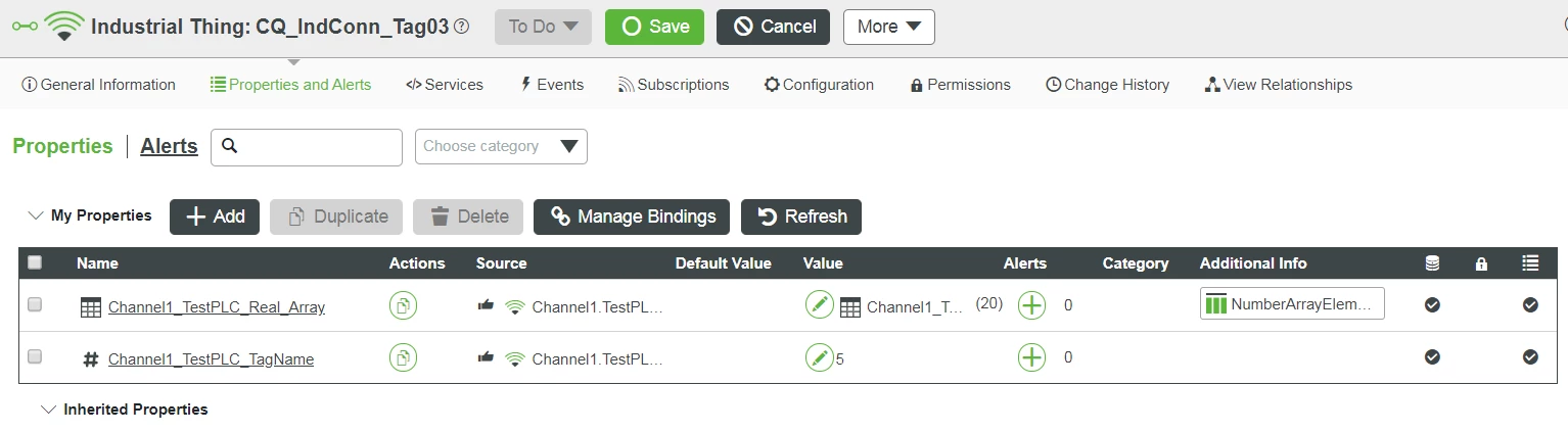 I managed to map the float array to ThingWorx as an "Industrial Thing", on the Properties and Alerts page, I can refresh and I can see the values are updating. My array is 20 long. The value area shows the image associated with an info table, and the additional info shows it as a NumerArrayElement.