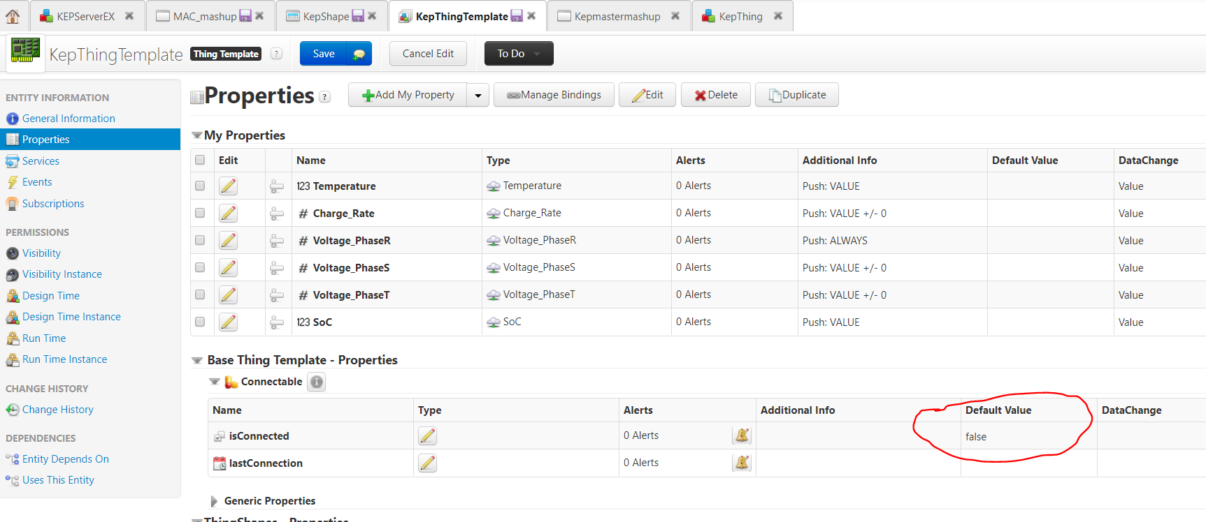 - I created my Industrial Connection (KEPServerEX) and industrial thing (KEPThing) in New Composer, as explained in the Help Center. Now I have created a template from the KEPThing, but this template is not connected so I cannot get data from Kepware despite it has inherited the KEPThing properties. In the mashup, I can call the "GetimplementedthingswithData" service and bind the data to the time series chart but, as the template is disconnected, there is no values displayed.