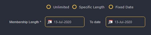 want to change the field according to radio button , 1)If unlimited is checked then membership length field is hide and 2)if specific length is checked then membership length field show two field one for insert number and second for dropdown of day,week,monthand year and 3) If fixed date is checked then membership length field show date picker for start date and end date. please refer below attachment