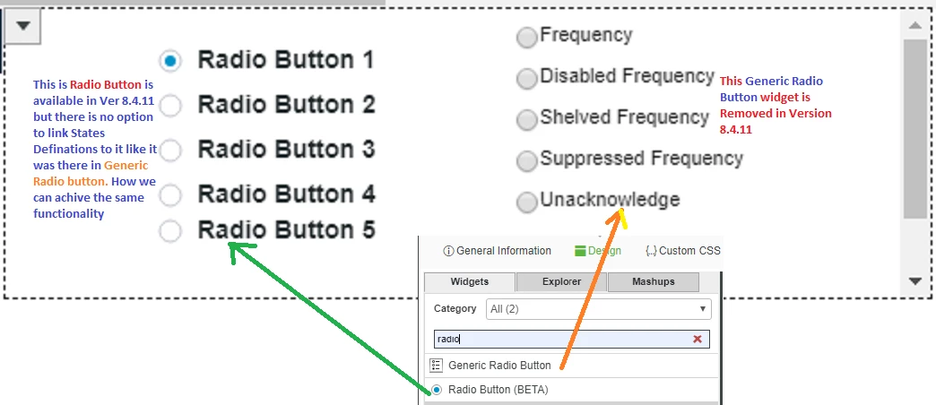 I have upgraded on Mashup manually from TWx Ver 8.4.5 to Ver 8.4.11. I found the Generic Radio Button Widget is removed in TWx Version 8.4.11, and hence I have to achieve the similar functionality using simple Radio Button Widget available there, with help of available State definitions. I put same Group name for all buttons but not getting any hint how I could use previously defined State Definitions to work similar like old Generic Radio button Widget.