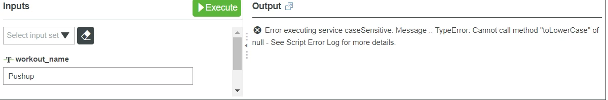 Now i want to compare that workout names with the input by using case sensitive. here is a javascript code which is giving me database workoutnames. when i am giving input "pushup" then result is showing already exist which is correct output but when i am giving an input "Pushup" then it's showing result as "Error executing service caseSensitive. Message :: TypeError: Cannot call method "toLowerCase" of null" instead of "already exist" so help me with this peoblem.