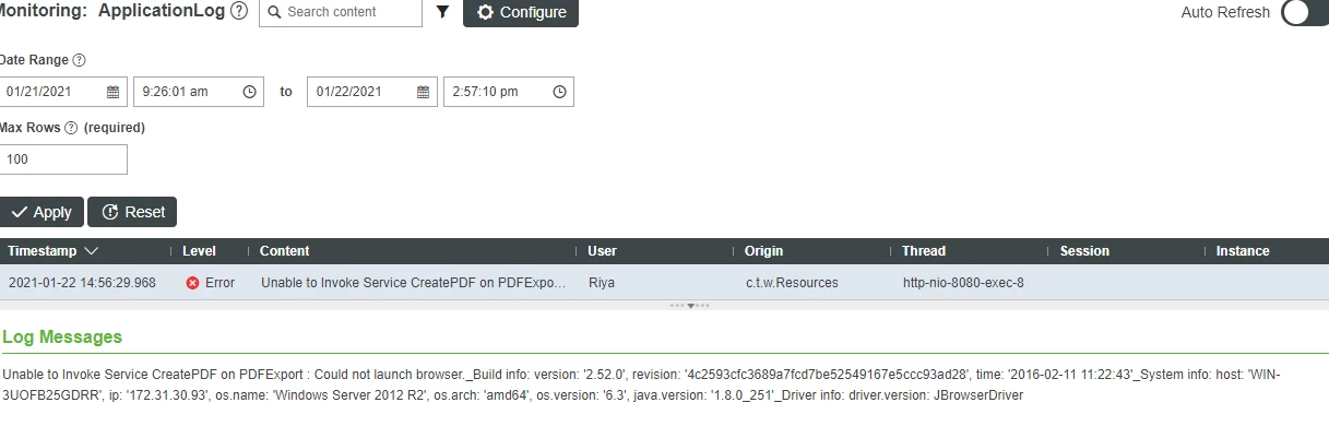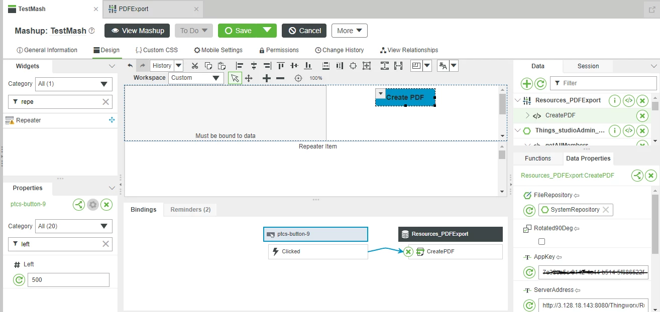 I'm using Thingworx 9.0 version and I want to generate pdf file. I'll refer this post and I import an pdf extension in Thingworx and follow all steps with give an all inputs to parameter But I'm getting an error ,when I click on button. I'll search on this error and refer this post but it is not working so Please refer the below attachment and suggest
