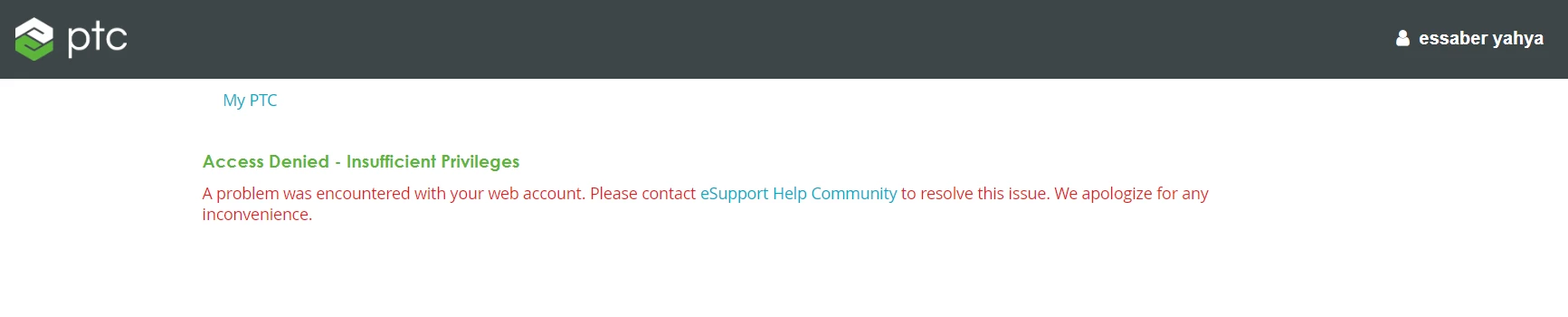 "Access Denied - Insufficient Privileges A problem was encountered with your web account. Please contact eSupport Help Community to resolve this issue. We apologize for any inconvenience."