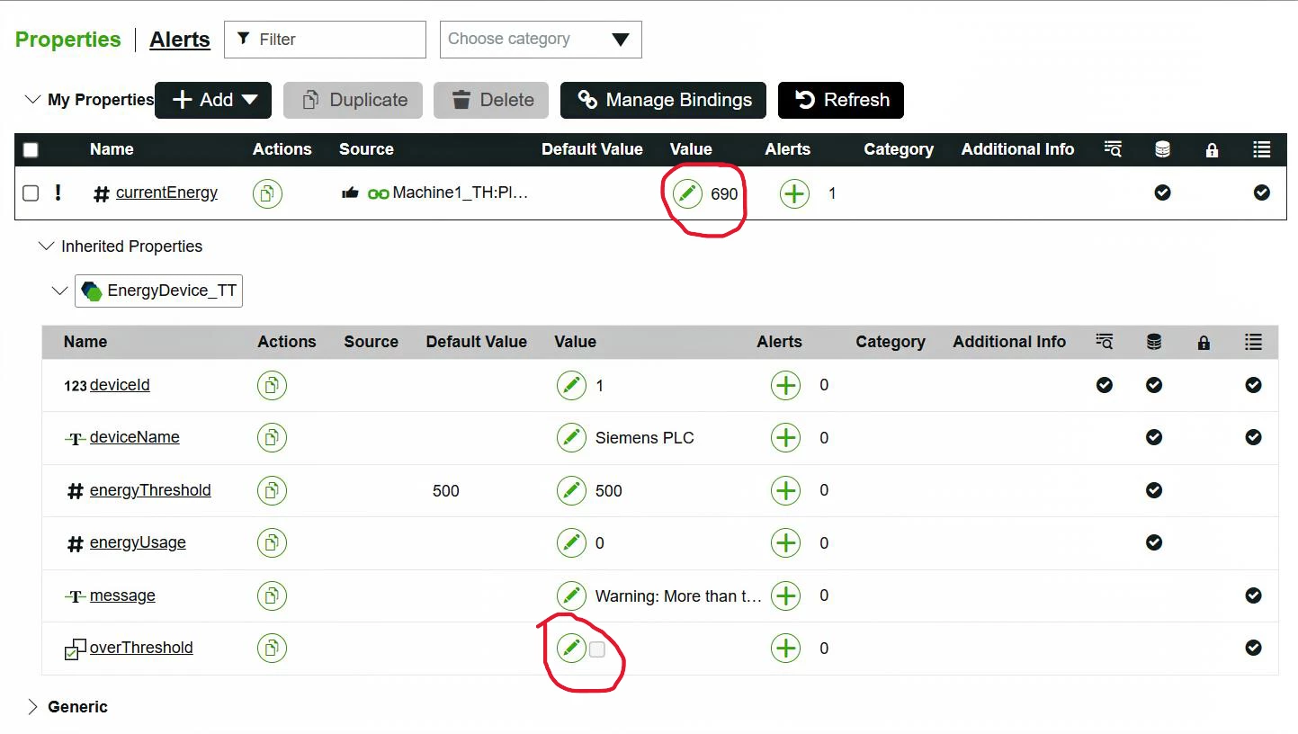 A service is written in the ThingTemplate. In this service, the logic compares currentEnergy with energyThreshold . If currentEnergy > energyThreshold , the overThreshold property is set to true.