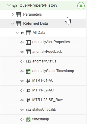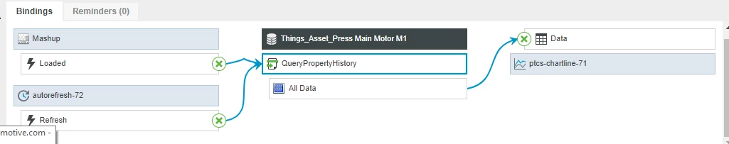 I have a simple mashup where I want to display data coming from a value stream. I have a remote thing connected to a KepServer Gateway that retrieves sensor data each second. In the mashup builder, I add the queryPropertyHistory service for the data.