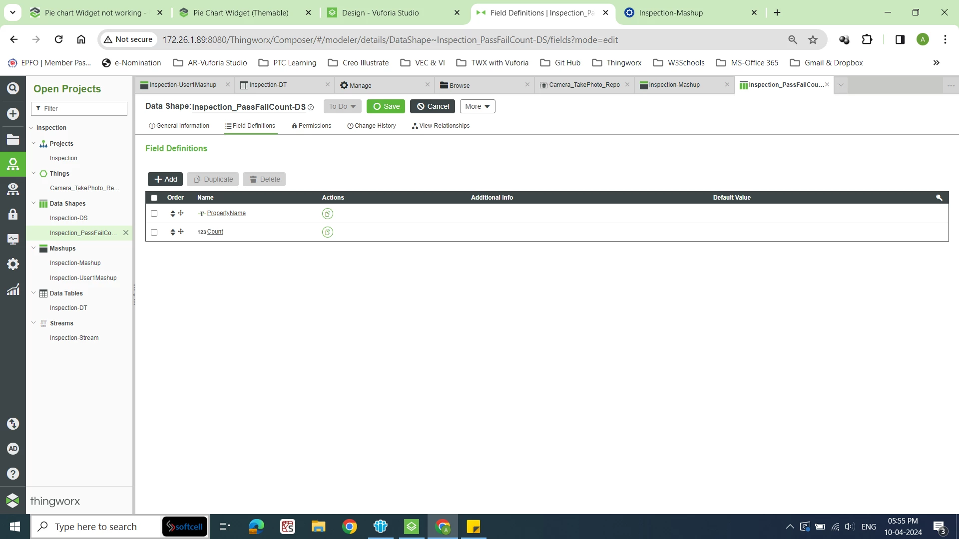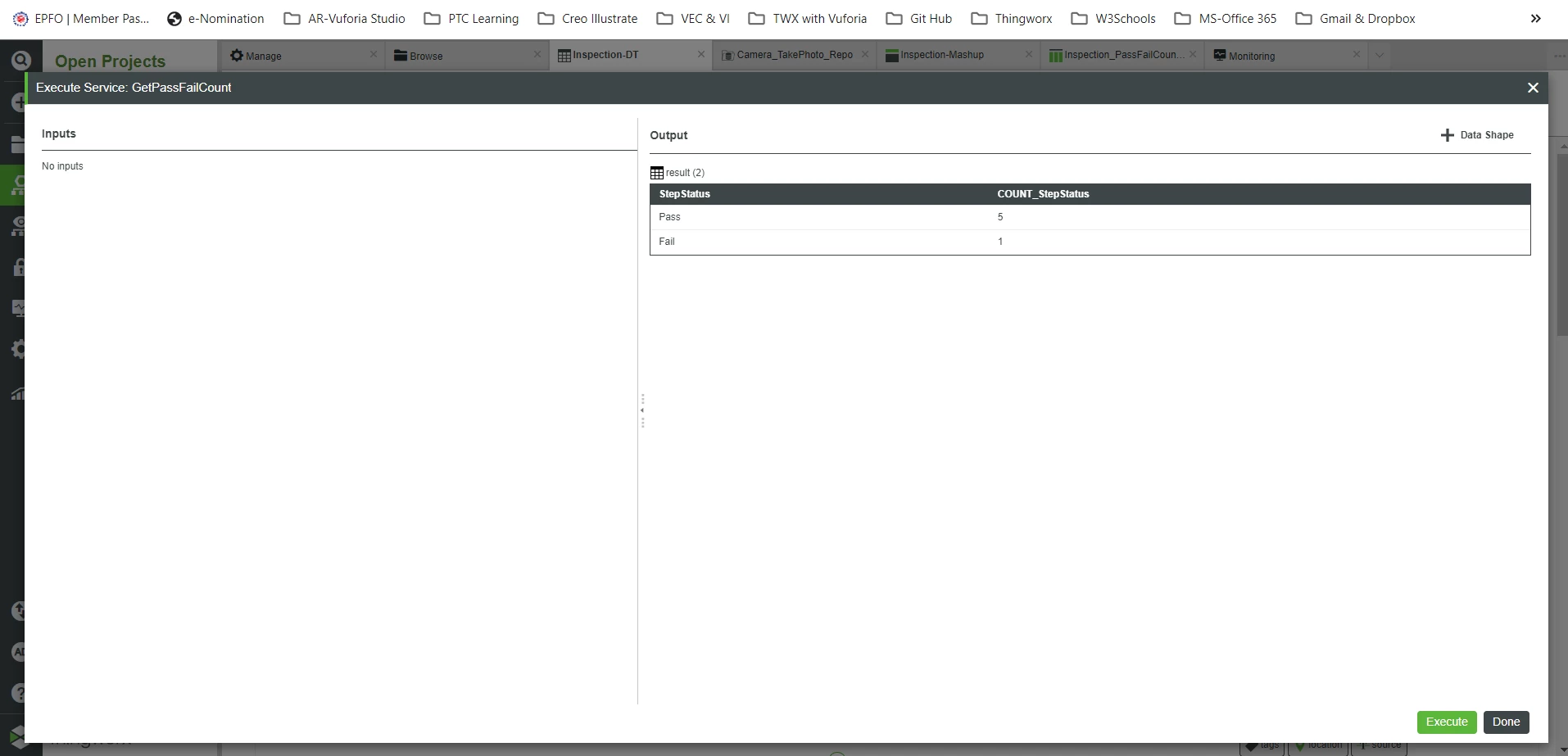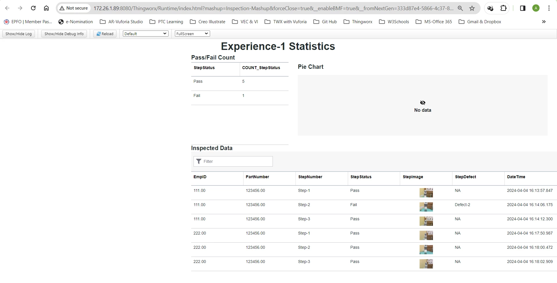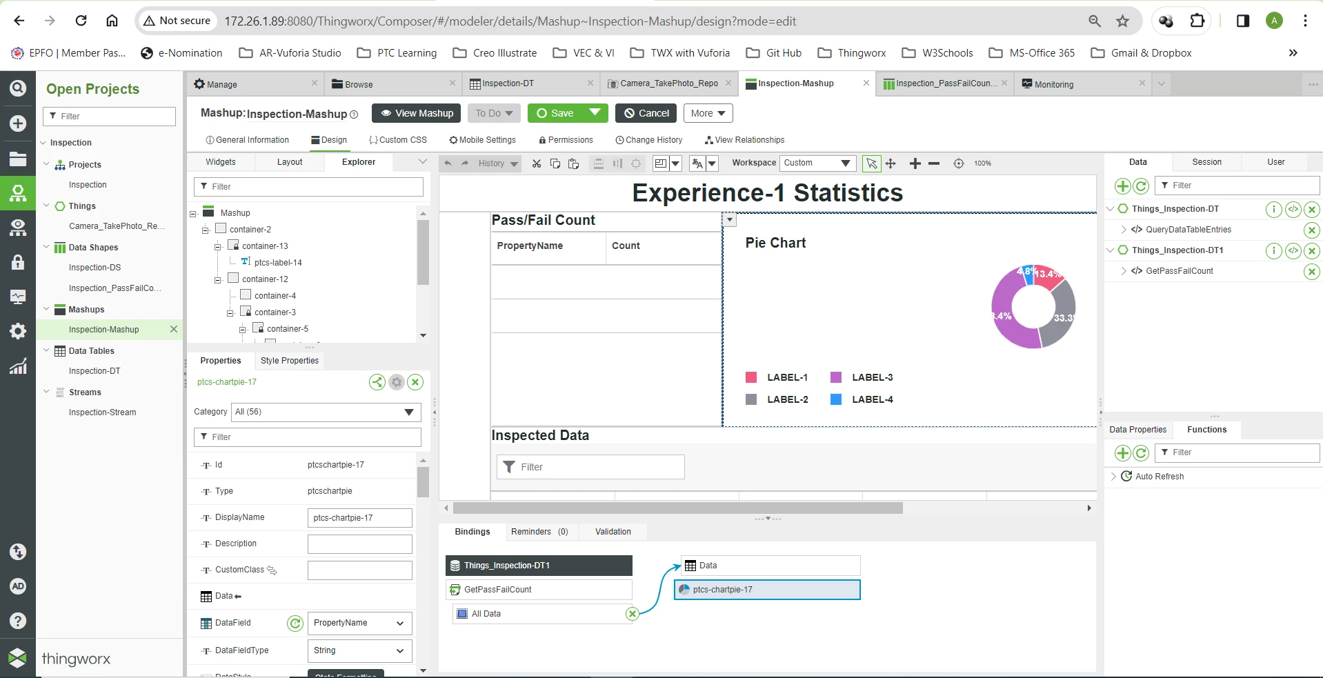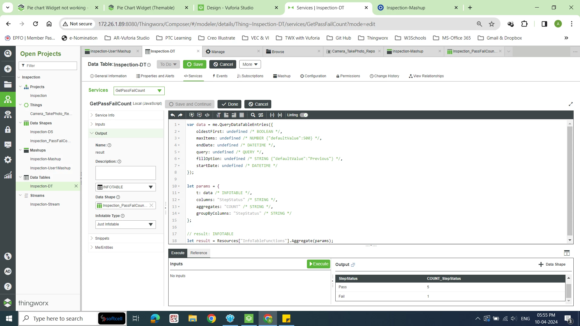 I have a service which has infotable as an output(Service.png). I have bound all data of that service to pie-chart widget(Binding.png) in thingworx mashup. After viewing the mashup it says no data in mashup(Mashup.png).